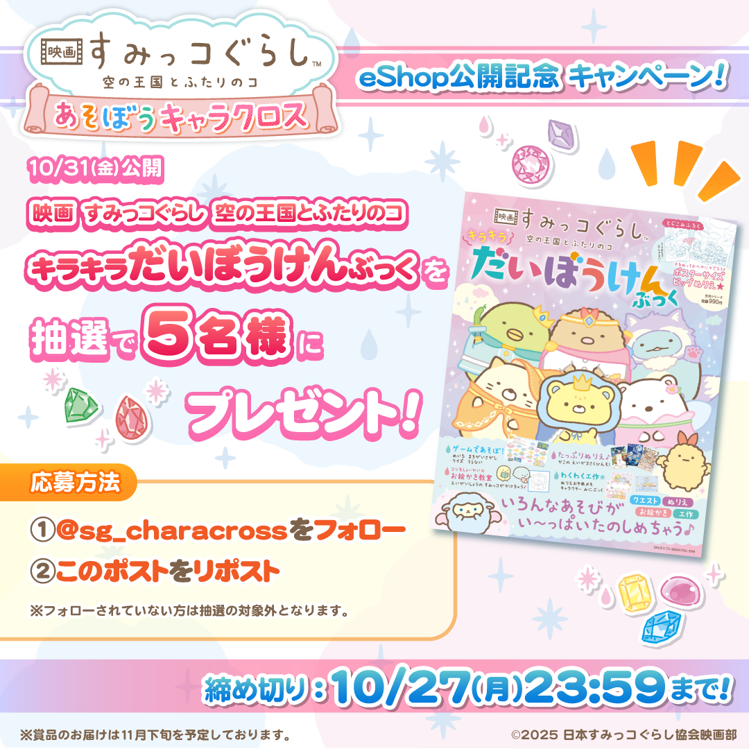 Nintendo Switch™ソフト『映画 すみっコぐらし 空の王国とふたりのコ あそぼうキャラクロス』のeShop公開を記念し、『映画 すみっコぐらし 空の王国とふたりのコ キラキラだいぼうけんぶっく』を抽選で5名様にプレゼントいたします!