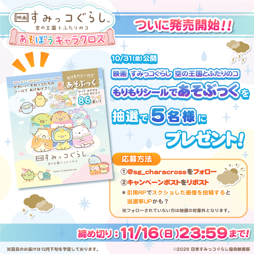 Nintendo Switch™ソフト『映画 すみっコぐらし 空の王国とふたりのコ あそぼうキャラクロス』の発売開始を記念し、『映画 すみっコぐらし 空の王国とふたりのコ もりもりシールであそぶっく』を抽選で5名様にプレゼントいたします!
