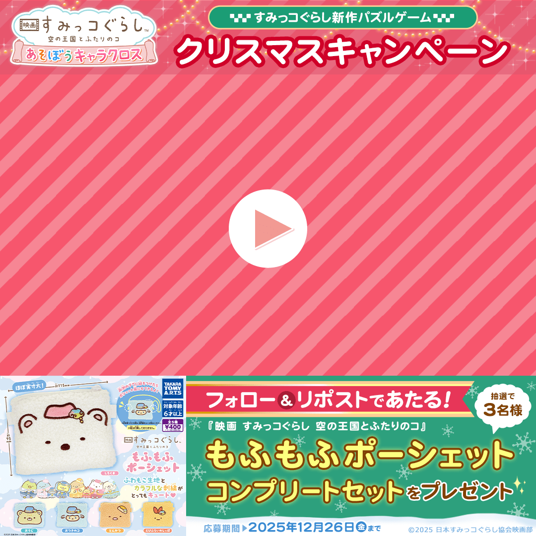 Nintendo Switch™ソフト『映画 すみっコぐらし 空の王国とふたりのコ あそぼうキャラクロス』クリスマスキャンペーンを開催いたします。『映画 すみっコぐらし 空の王国とふたりのコ もふもふポーシェット』コンプリートセットを抽選で3名様にプレゼントいたします!